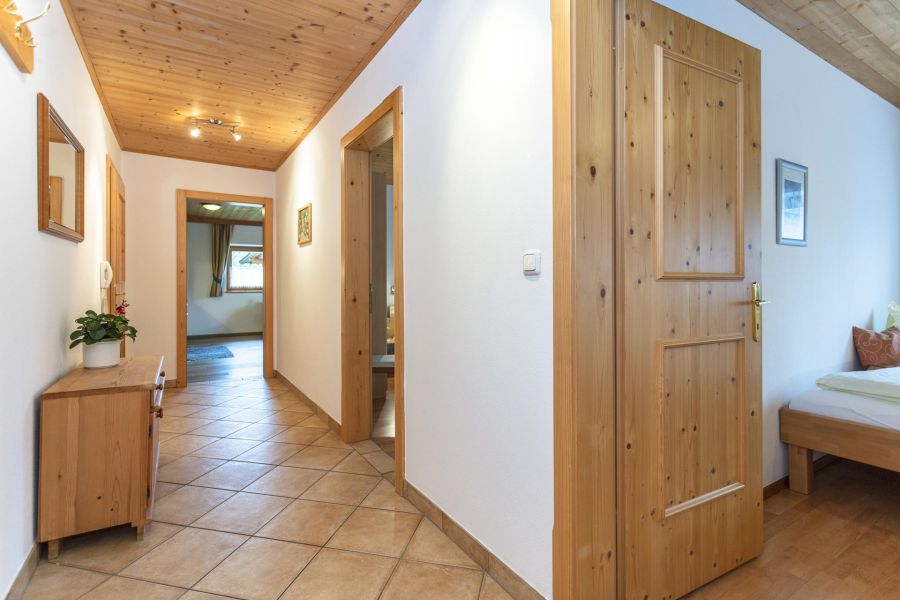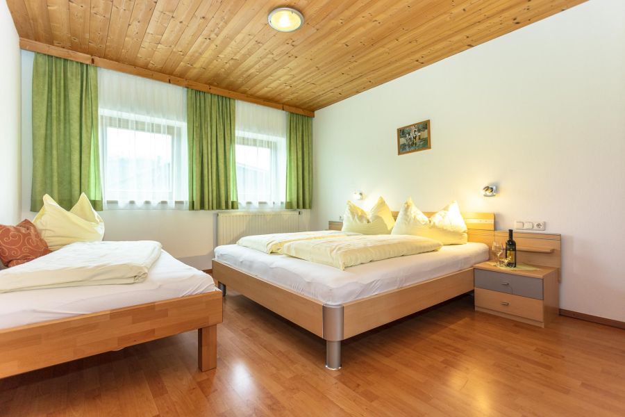 Die Ferienwohnung 2 im Erdgeschoß garantiert einen erholsamen Urlaub auf dem Bauernhof. Hier finden Sie in der großen Wohnküche neben einer voll ausgestatteten Küchenzeile eine Essgruppe sowie eine Couch-Ecke. Vom Vorraum mit Garderobe aus kommen Sie in die beiden separaten Schlafzimmer mit Doppelbett (und bei Bedarf Zustellbett), in das Bad mit Badewanne und Waschtisch sowie in das separate WC. Von der Terrasse vor dem Haus aus haben Sie einen traumhaften Ausblick auf die Tiroler Bergwelt.